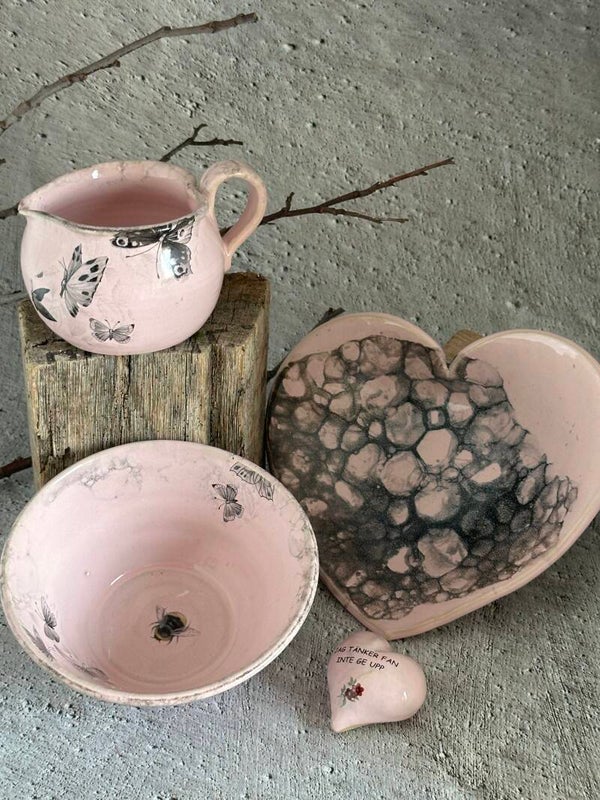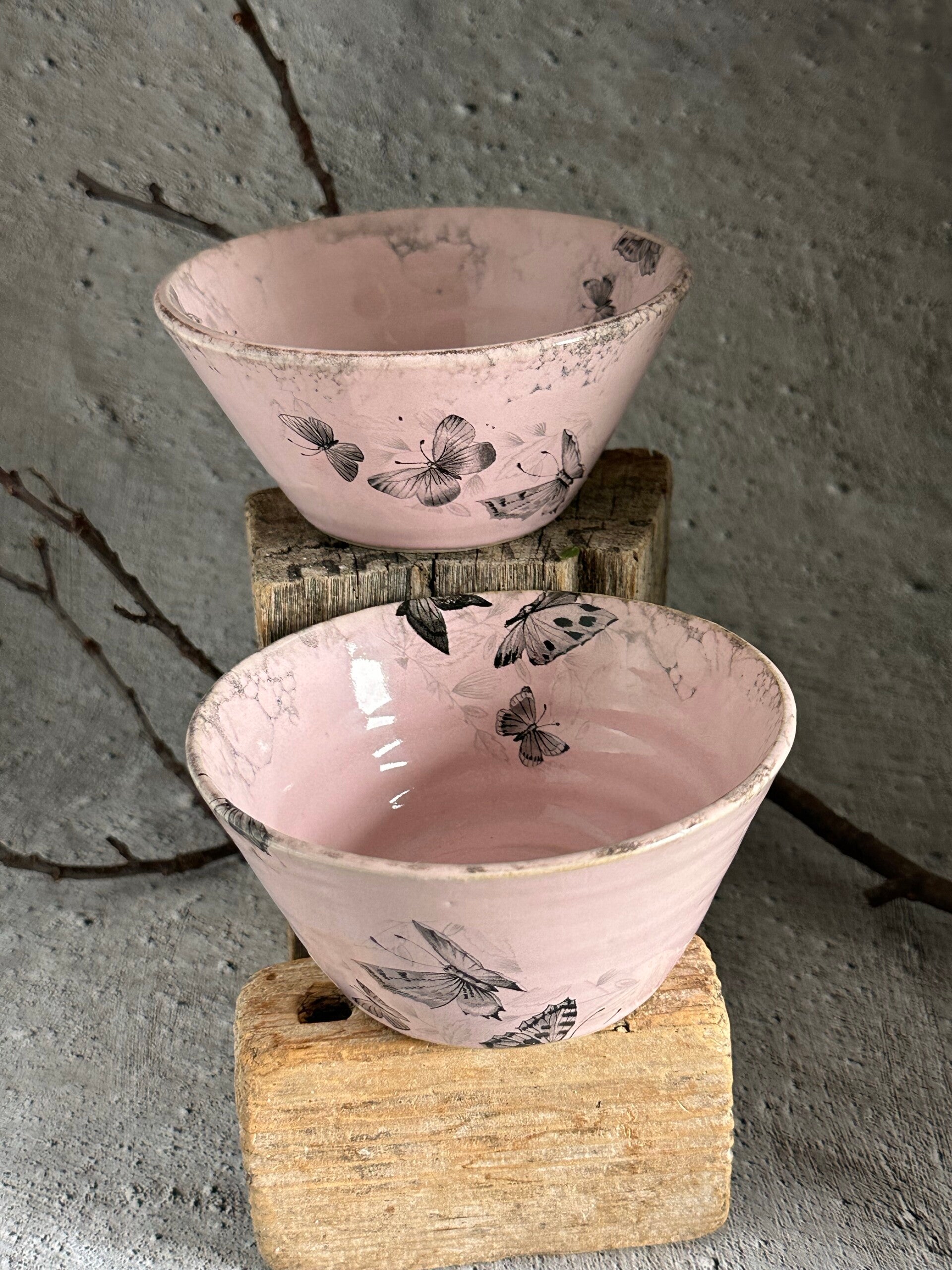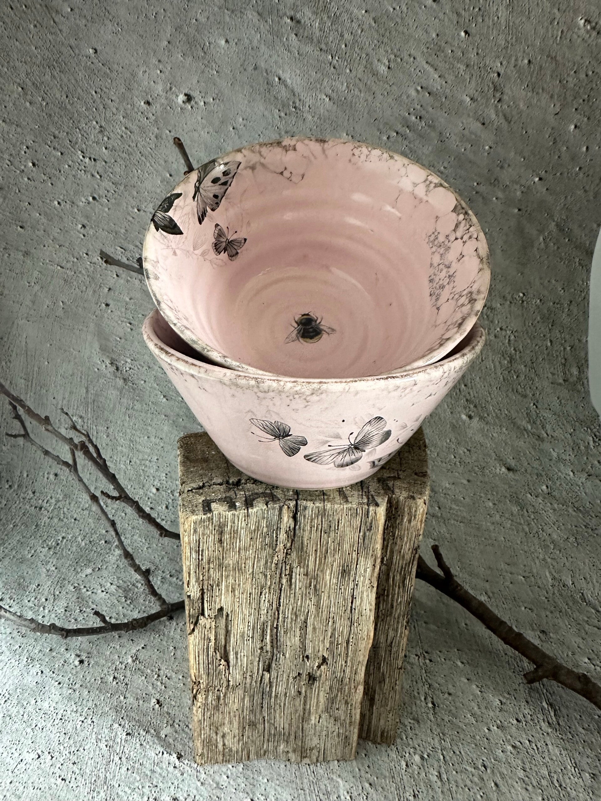 Drejad skål i stengodslera meden rosa blank glasyr och dekaler med fjärilar.
