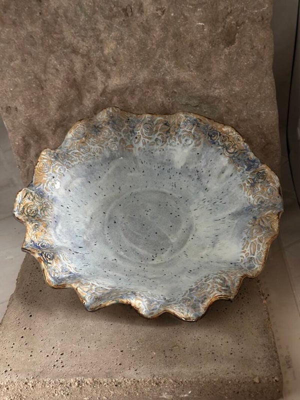 Trevlig stor fat i stengodslera med en vågig kant.Glasyren är blank ljusblå med små prickar.